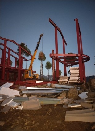 Lambda Engineering executed the design and detailing of large-span roof trusses and multistory framing systems erected over an elevated reinforced concrete base. The project combined heavy industrial design requirements with architectural functionality, showcasing precision alignment and modular on-site assembly in complex terrain.