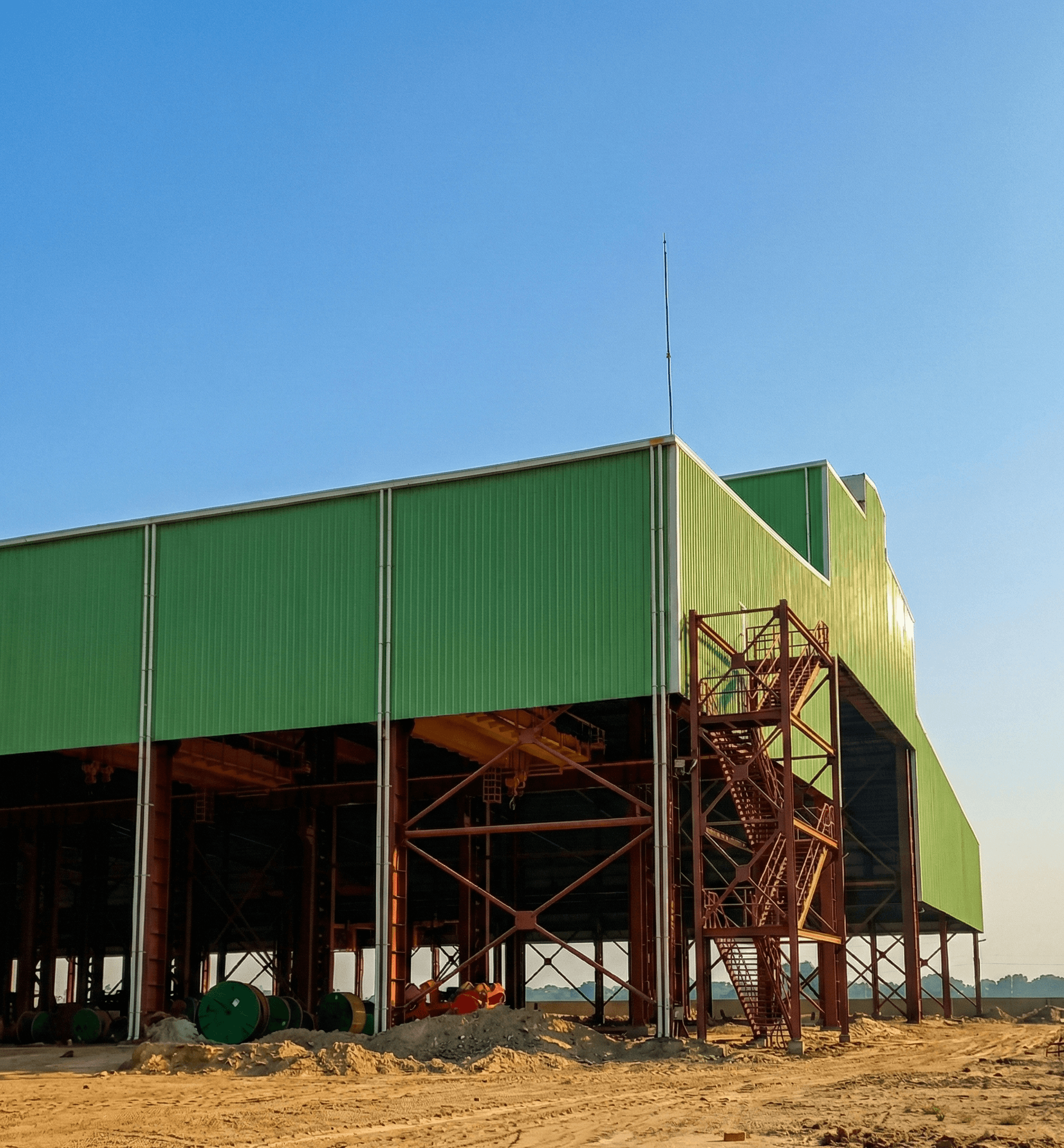 Support System: Anchored on RCC columns with base plates and shear keys designed for uplift resistance.